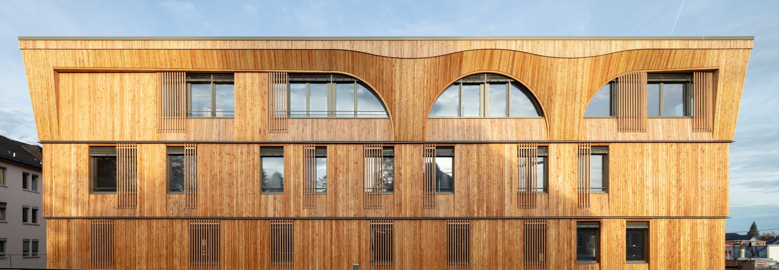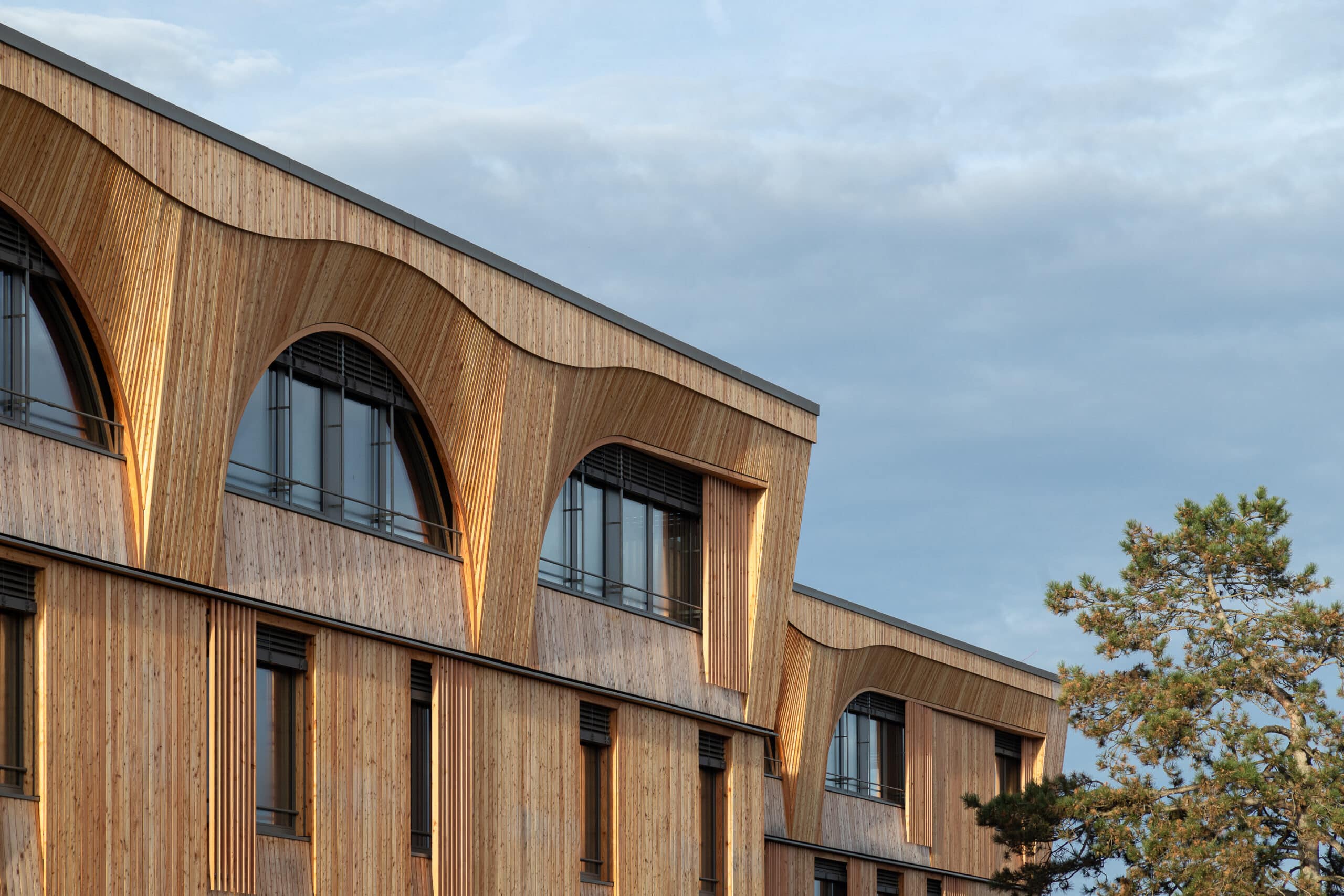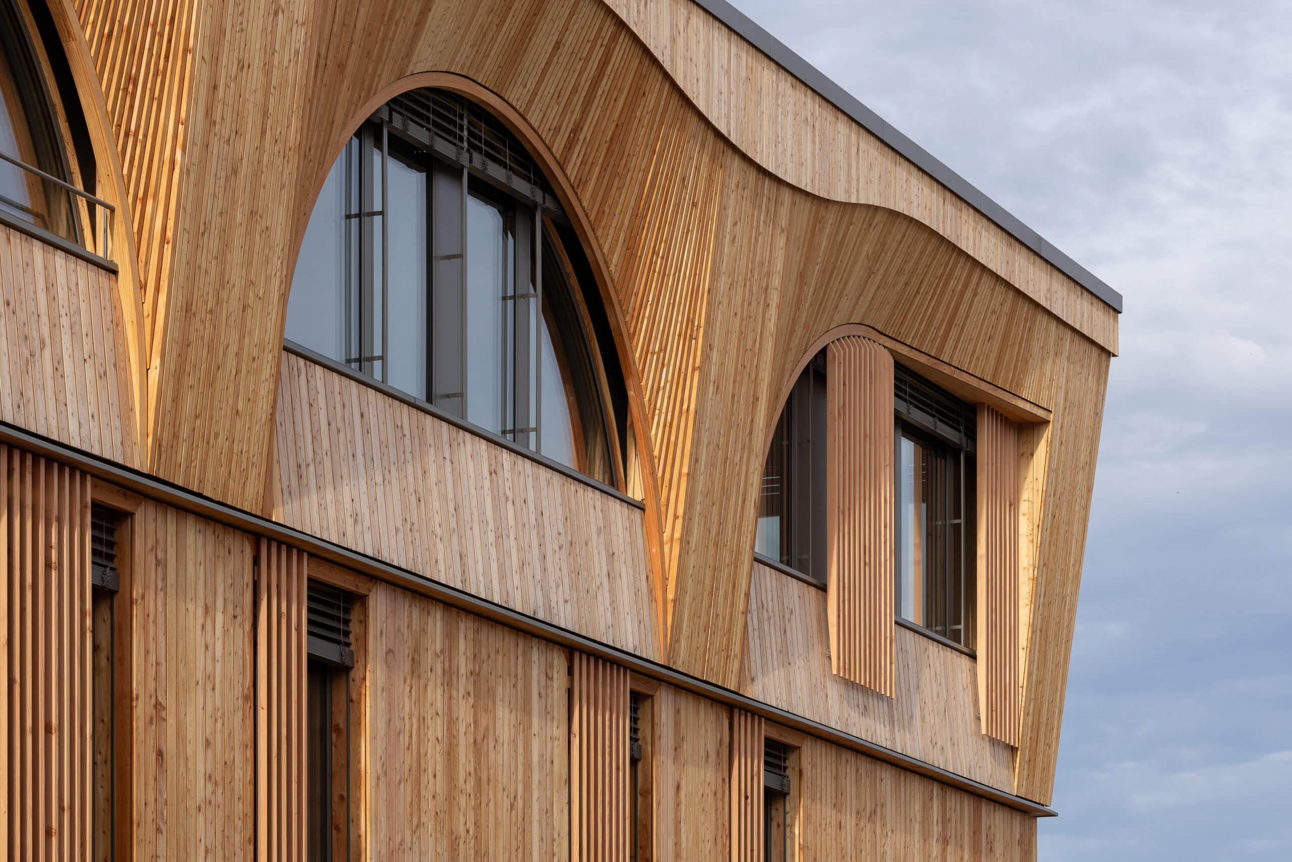 Die geometrisch klar gefasste Bogenform der Fassade transformiert den Klinikneubau in ein skulpturales, dreidimensionales Bauwerk mit halbkreisförmigen Fensteröffnungen. Die rhythmisch angeordneten Fensterreihen und die plastische Tiefe der Holzoberfläche verleihen dem Gebäude eine lebendige Wirkung.